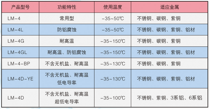 LM-4系列冰河冷媒具有低毒,不易燃,比熱大,安全穩(wěn)定,載冷能力強(qiáng)等優(yōu)點(diǎn)。對(duì)碳鋼、不銹鋼、紫銅等金屬防銹性能優(yōu)良。在不同濃度條件下,可以在很寬的溫度范圍內(nèi),廣泛應(yīng)用于各種制冷系統(tǒng)。使用時(shí),根據(jù)具體工藝溫度要求單獨(dú)使用或用水稀釋成適當(dāng)濃度后應(yīng)用。如與醇類載冷劑混合使用,應(yīng)加入適量的冰河冷媒增效劑。其中: